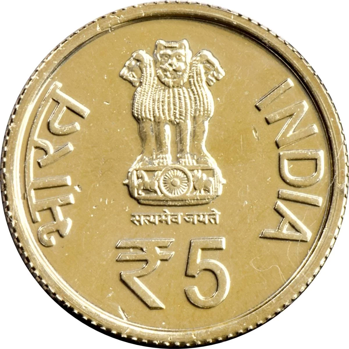 Ashoka Pillar Lion Capital with "Satyamev Jayate" and ₹5 denomination.