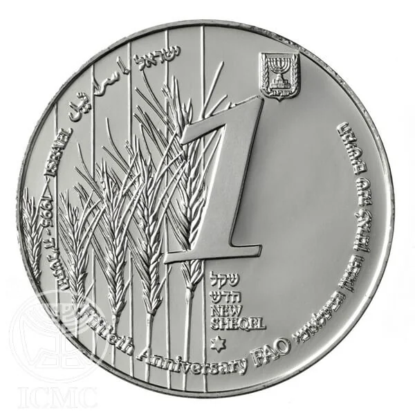 Silver 1 New Sheqel coin. Obverse: Face value in Hebrew and English, State Emblem. Reverse: Ears of grain with inscriptions "Fiftieth Anniversary FAO" in Hebrew and English, "ISRAEL" in Hebrew, Arabic, and English, and the dual date 1995/5755.