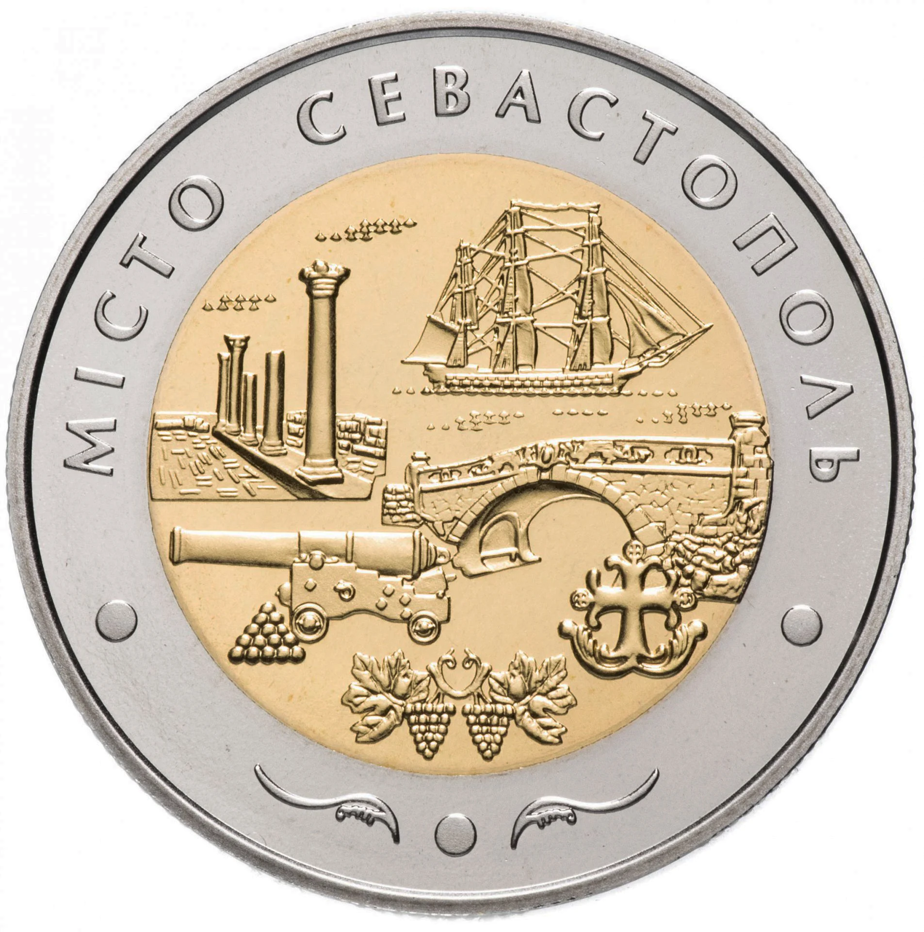 The legend "МІСТО СЕВАСТОПОЛЬ" tops the design. Below, a sailing ship overlooks symbols of the city: an early 20th-century bridge, an anchored cross, a naval cannon with the ruins of Chersonese above it, and a pyramid of cannonballs. Grape bunches and leaves adorn the bottom.