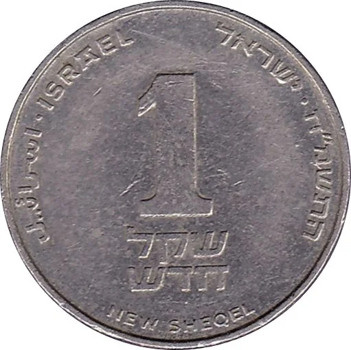 "1 New Sheqel" in Hebrew and English; the date in Hebrew; "Israel" in Hebrew, Arabic, and English.