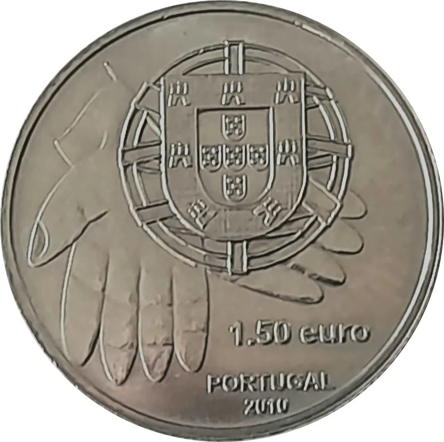 Portugal's coat of arms on two hands. Inscriptions: "PORTUGAL," "1.50 euro," and "2010."