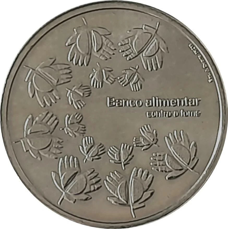 Sculptor John Duarte’s coin symbolizes giving and sharing. Two hands holding bread represent humanity and sustenance. Multiple hands circle inward toward the coin’s center, growing smaller as they near the bank, creating a dynamic chain of solidarity through offering.