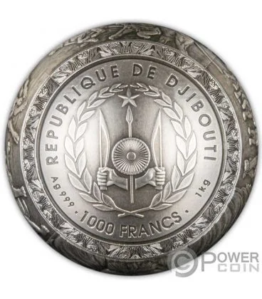 The obverse lower cap features Djibouti's coat of arms, encircled by the issuer name, fineness, value, and mass.