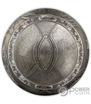 The upper cap reverses the design: "BIG 3" at the centre, two African outlines, and "RHINOS" with the year on the rim.