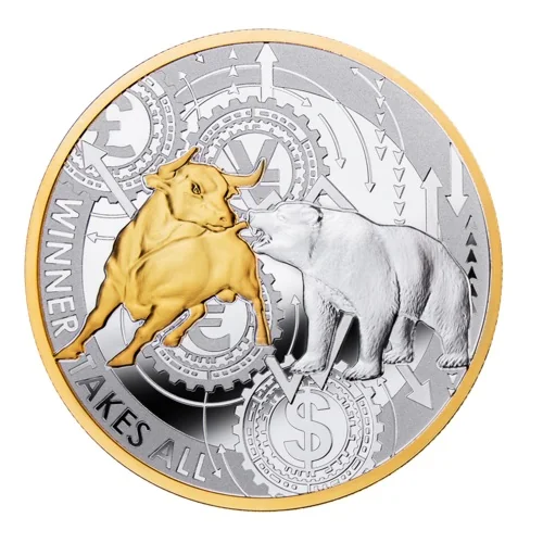 Bull and bear with currency symbols.
