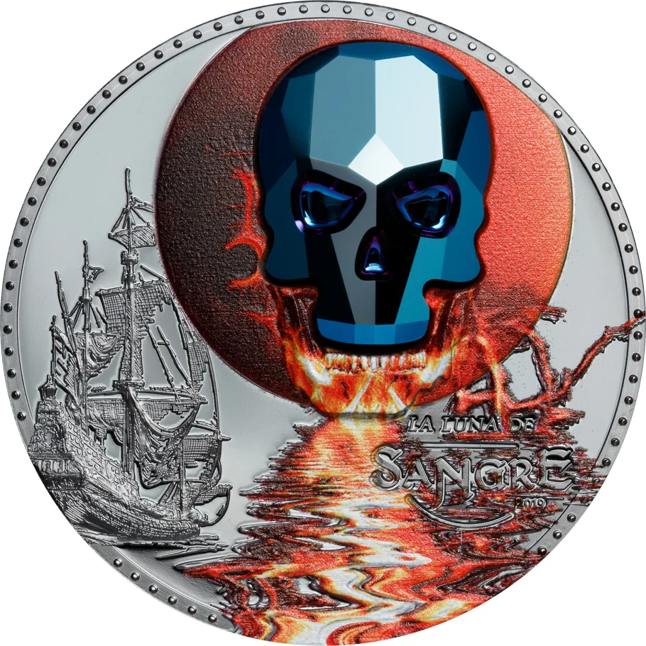 Sailboat beside a sea-reflected blood moon containing a Swarovski crystal skull.