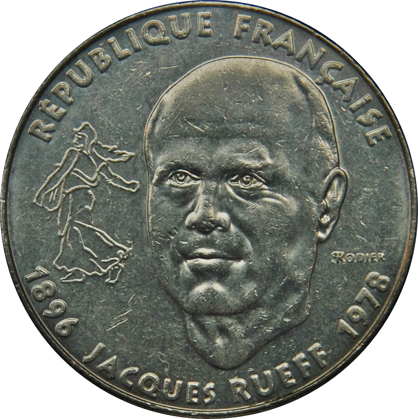 A portrait of economist Jacques Rueff with the Sower in the background. The legend reads "1896 JACQUES RUEFF 1978" and "RÉPUBLIQUE FRANÇAISE".