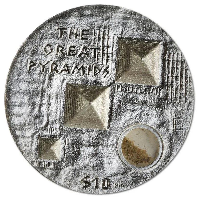Minted in ultra high relief (4.5-5.0 mm), the coin's uneven surface resembles an aerial view of the Great Pyramids on desert dunes. It contains authentic sand from the site, collected by the mint's Manufacturing Director.