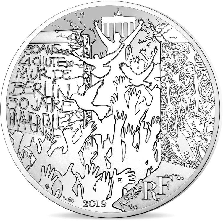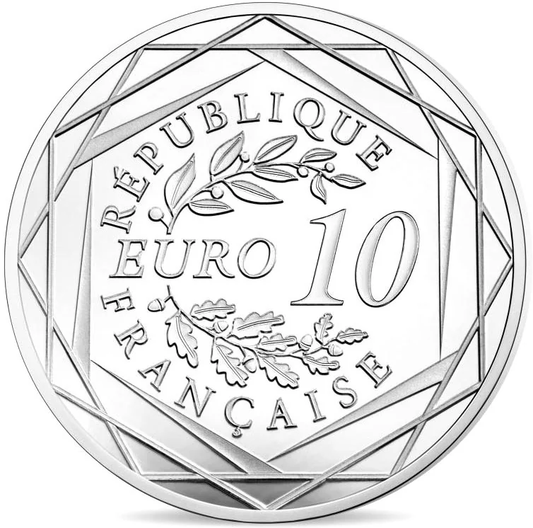 "10 EURO" flanked by laurel and oak branches, encircled by "RÉPUBLIQUE FRANÇAISE" and three hexagons.