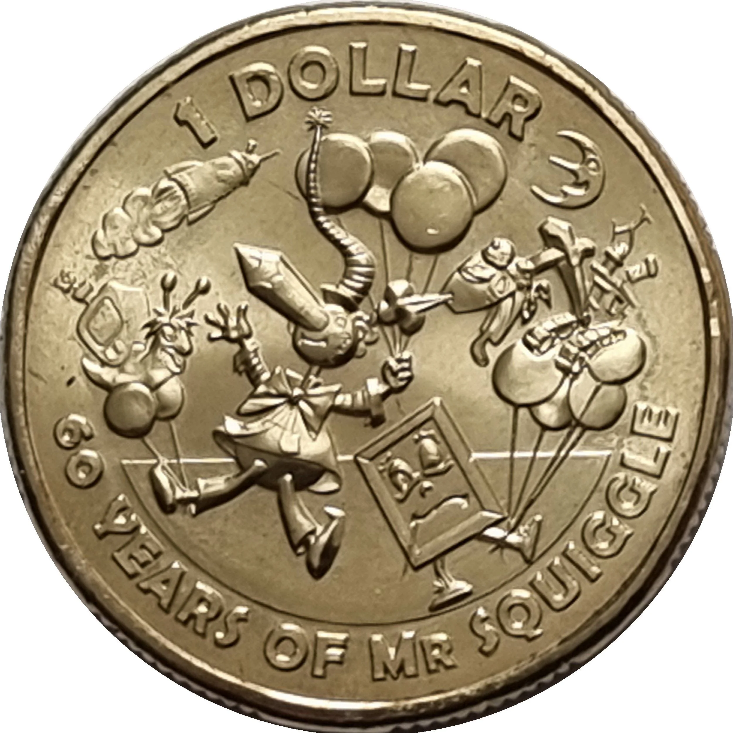 Mr. Squiggle holds four balloons, two tied to his right leg. Blackboard (lower right) has balloons on his left leg. Gus the Snail (left) and Bill the Steamshovel (right) sit on balloons. Rocket (upper left) and Moon (upper right) are nearby.