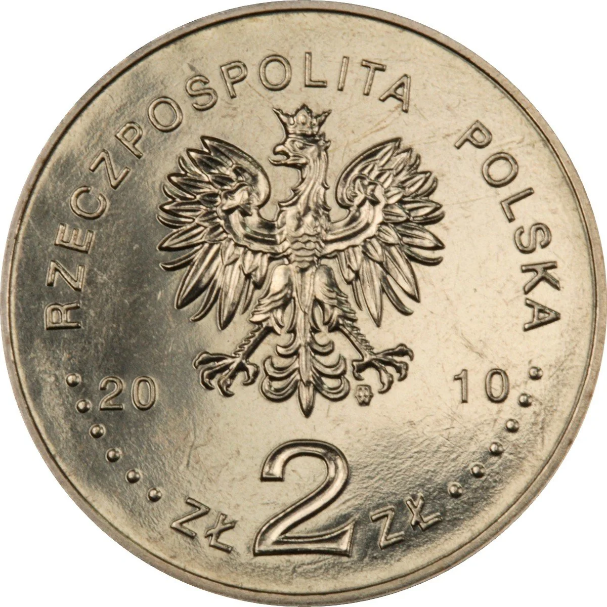 Poland's State Eagle emblem with year 20-10 on sides. Below: ZŁ 2 ZŁ. Perimeter inscription: RZECZPOSPOLITA POLSKA, flanked by six pearls each side. Mint mark M/W under eagle's left leg.