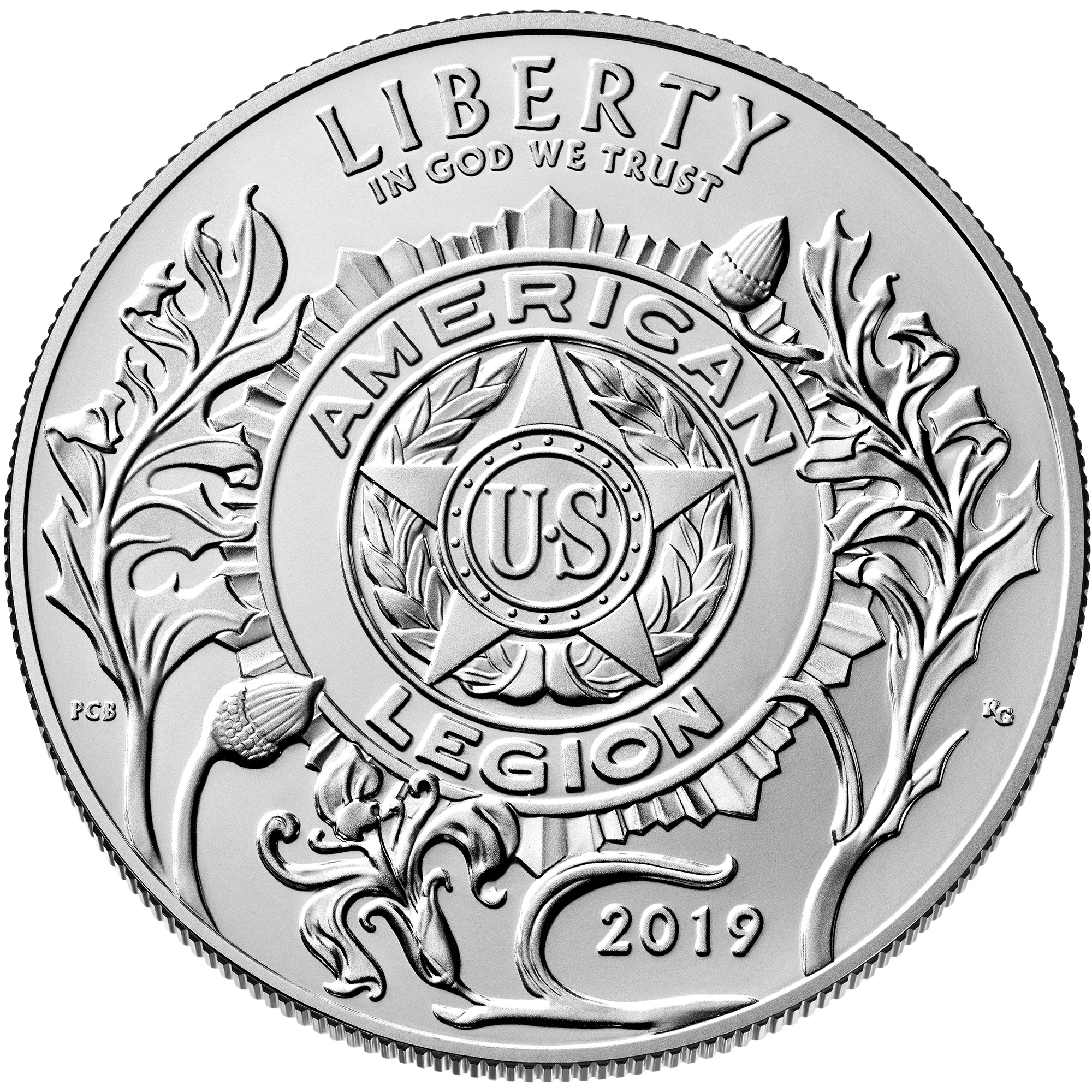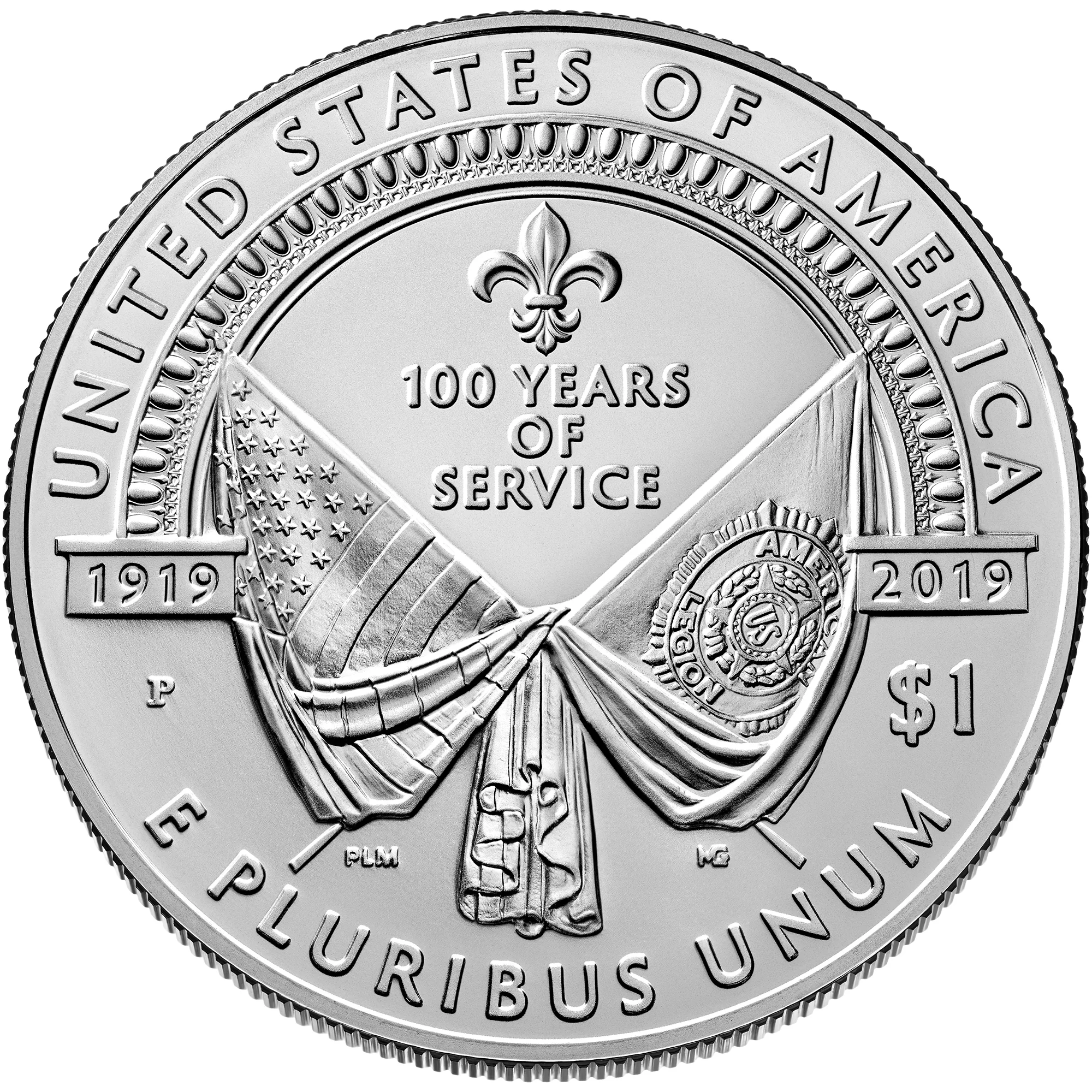 The reverse design depicts the 1919 Paris founding of the American Legion, featuring crossed flags under a fleur-de-lis and the inscription “100 Years of Service.”