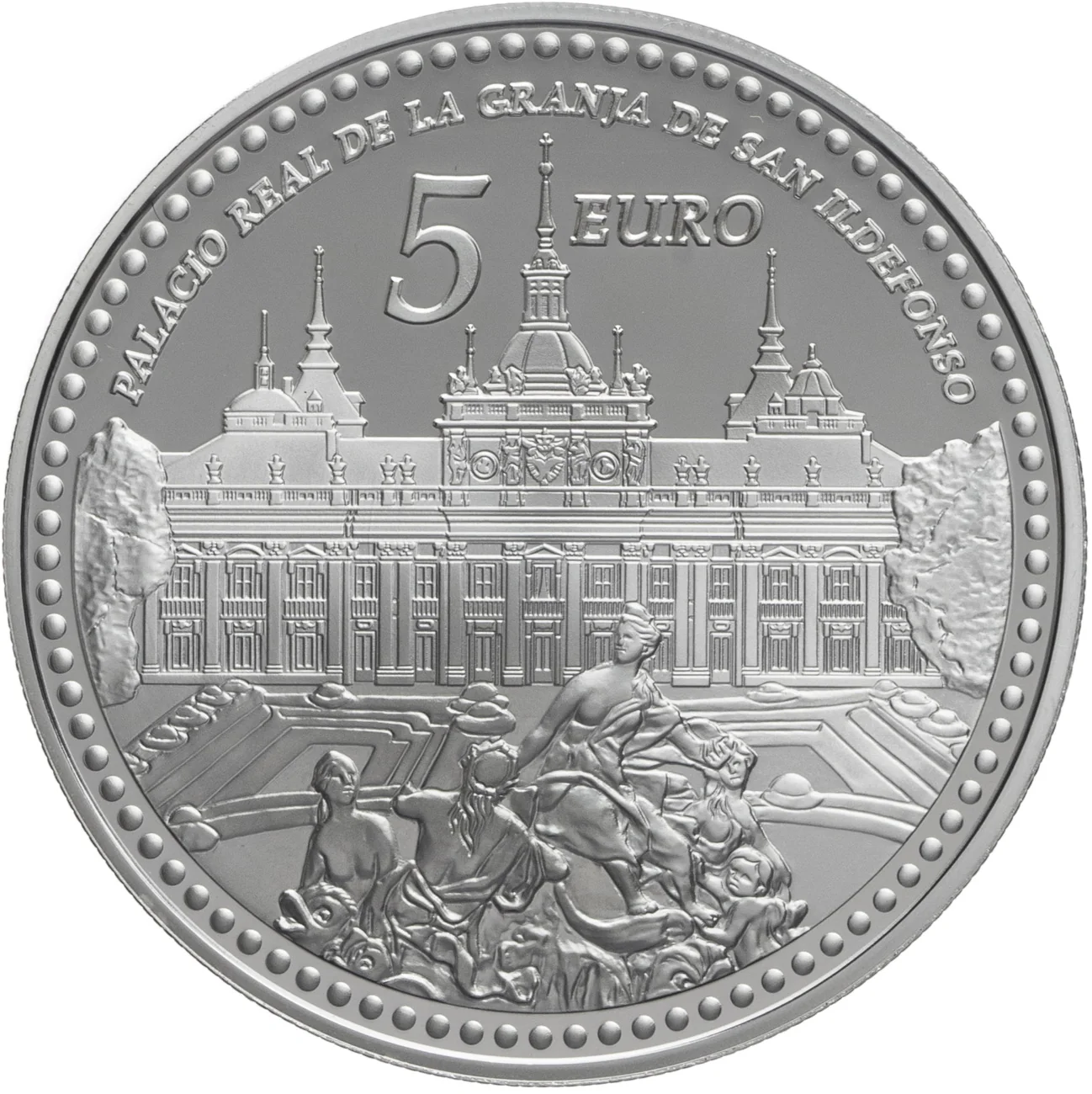 Reverse: the main façade of La Granja de San Ildefonso Royal Palace, with the Fountain of Amphitrite before it.