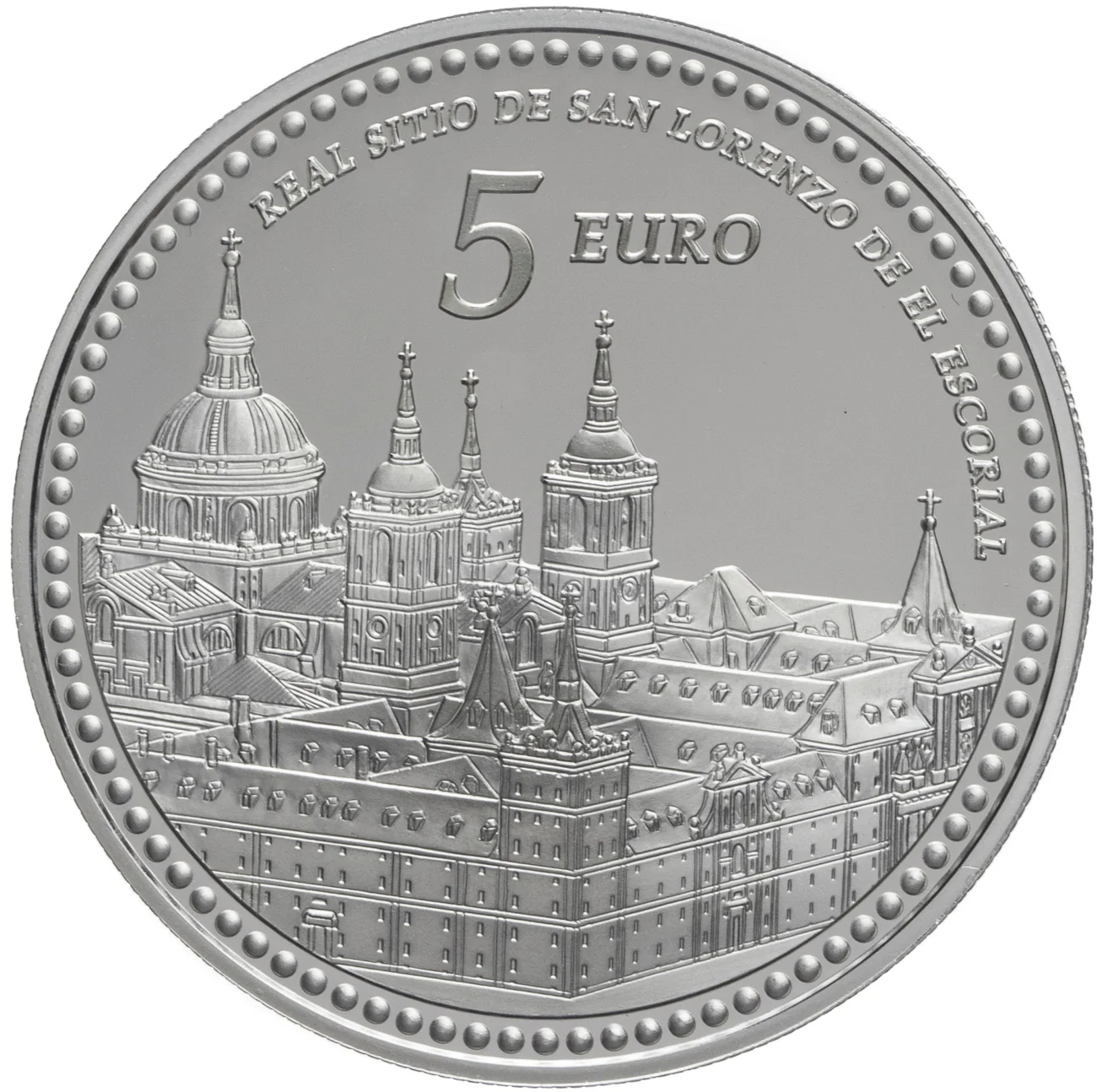 The reverse features the Royal Monastery of San Lorenzo de El Escorial, located in its namesake royal site near Madrid.
