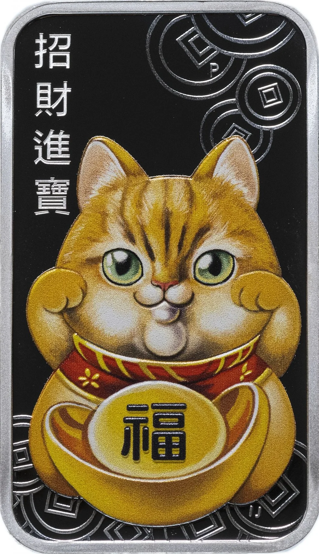 A golden lucky cat with raised paws, surrounded by ancient coins and a gold ingot marked with the character for 'good fortune,' and the phrase 'ushering in wealth and prosperity.'