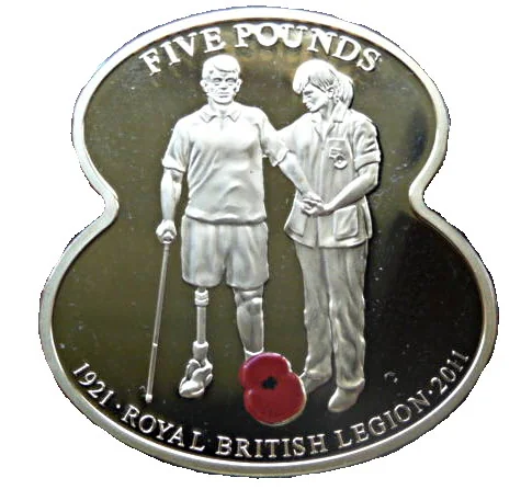 Nurse helping a soldier with a prosthetic right leg to walk; a value above and a colored poppy below.