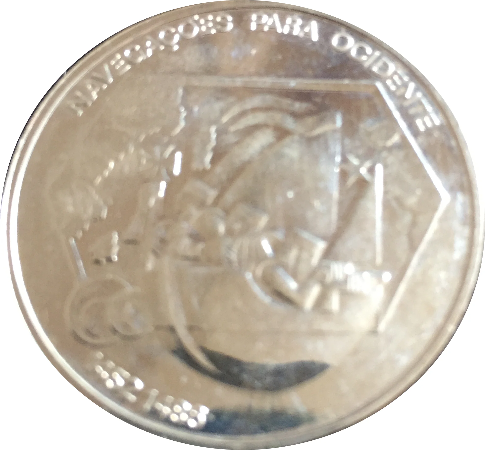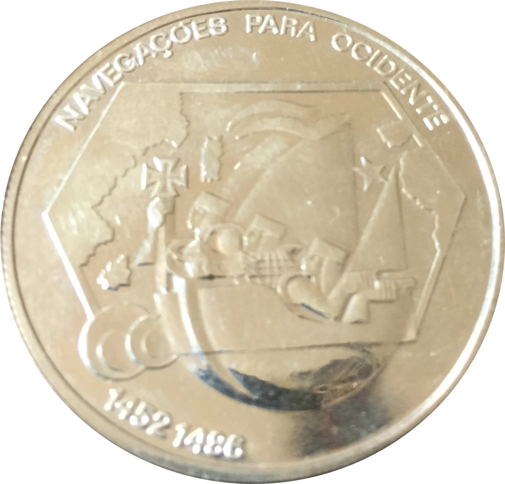 Portugal's coat of arms over a 1474 Toscanelli map (Europe/Africa right, Asia/Cipangu left) inside a hexagon, with the equatorial line. Value and date below.