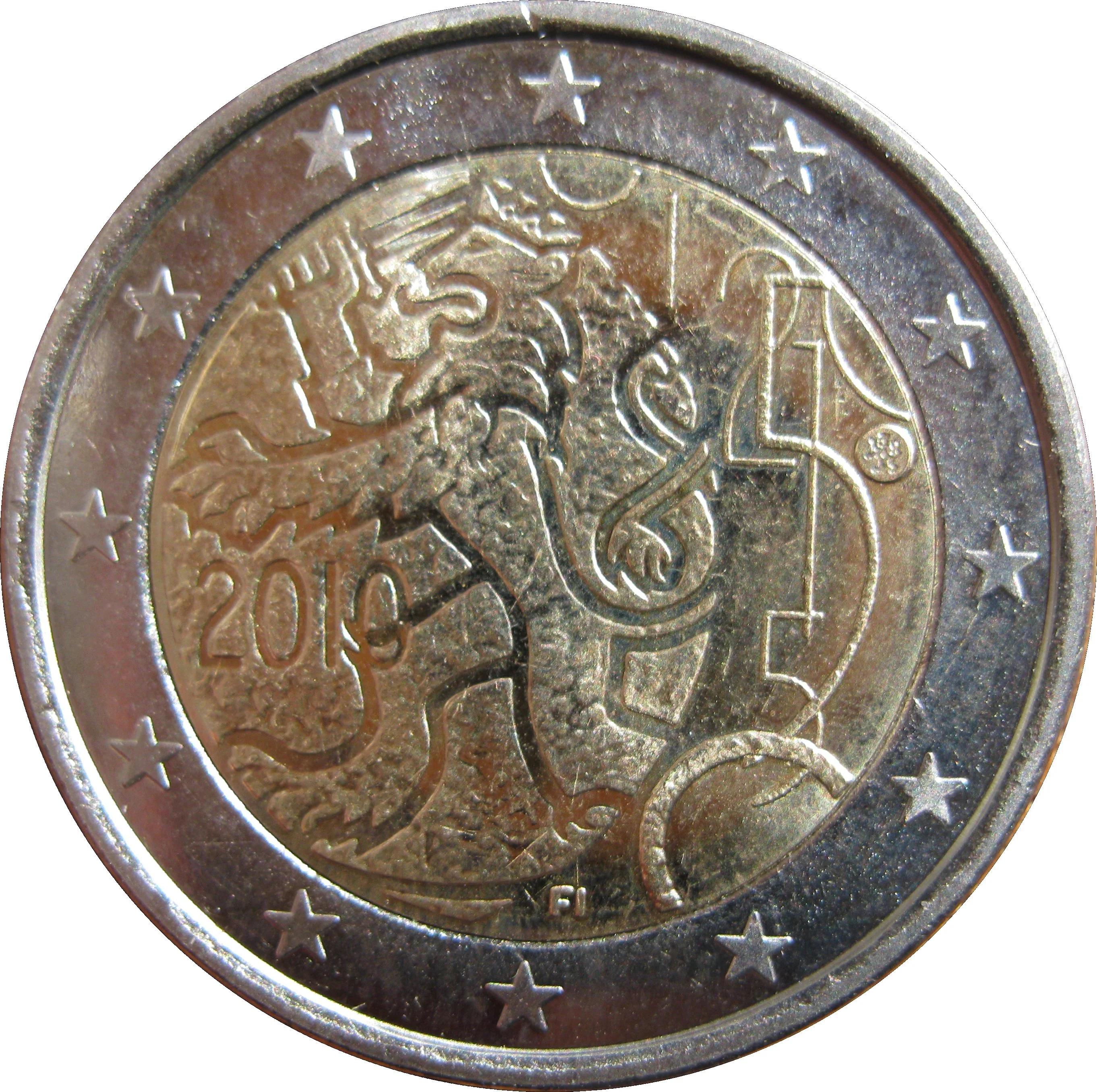 A stylized lion from the Finnish coat of arms, with the date left of centre and the mintmark with symbolic coin values to the right. The letters 'FI' are centred at the bottom. The outer ring features the 12 stars of the European Union.