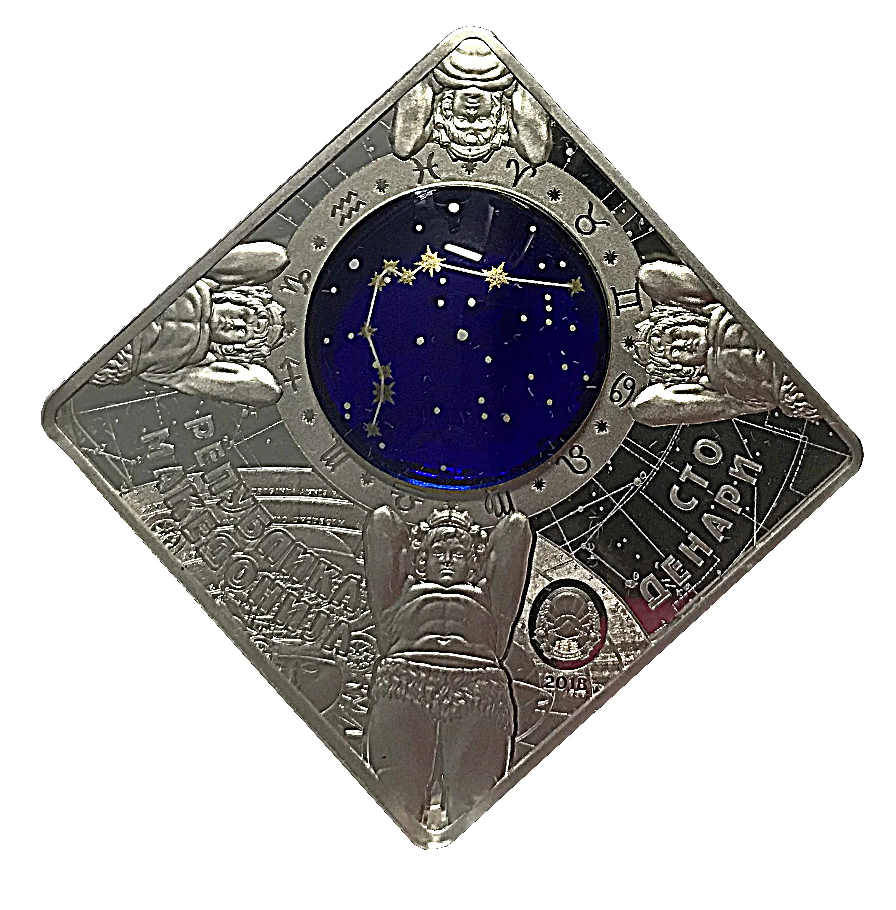 Four Atlases holding the sky above a zodiac circle, featuring the Macedonian coat of arms and inscriptions: “Република Македониjа” and “2018”.
