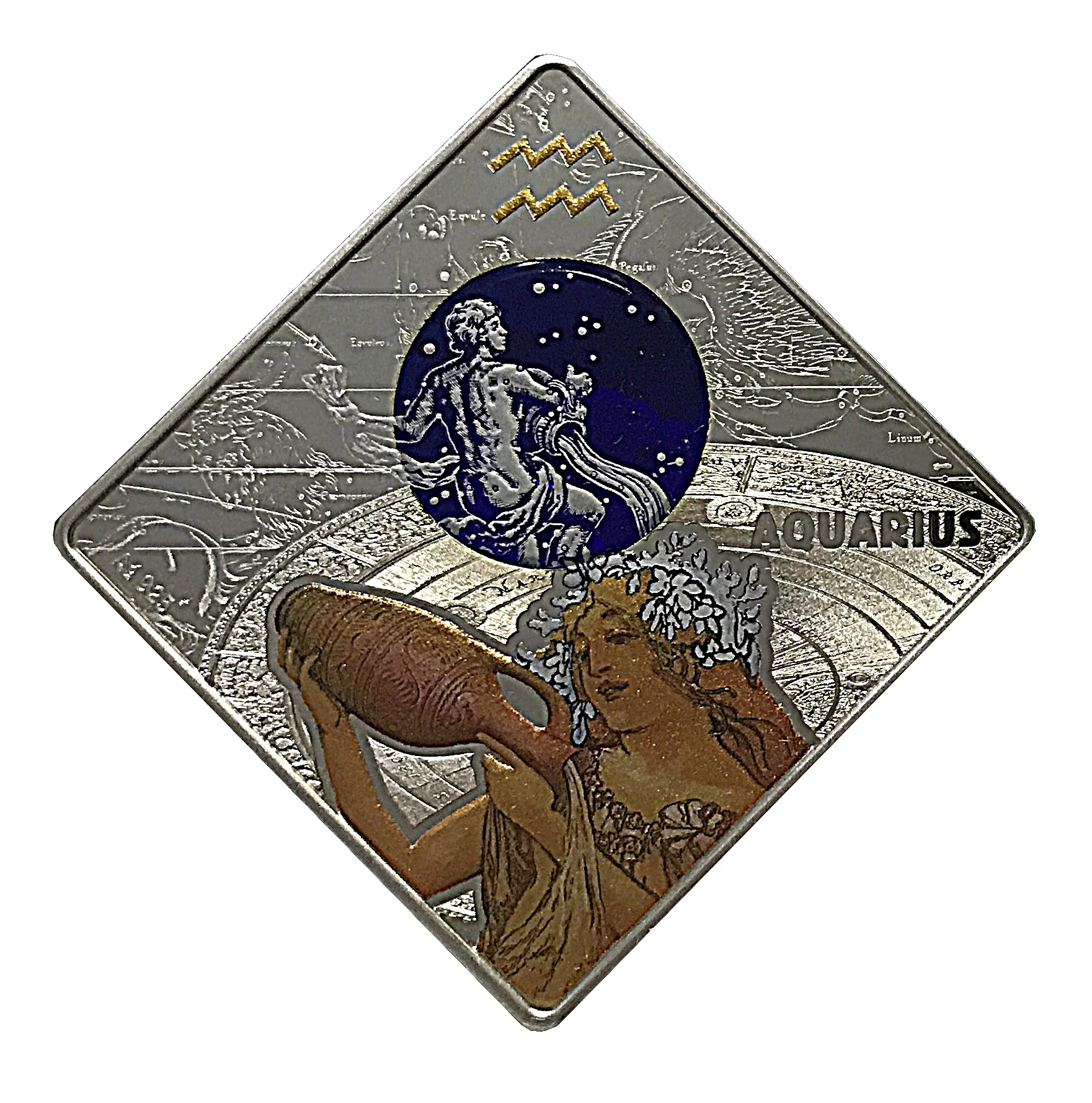A coin featuring Johannes Hevelius's 17th-century "Firmamentum Sobiescianum" star atlas, with the Aquarius constellation on a cobalt glass insert and its zodiac symbol above.