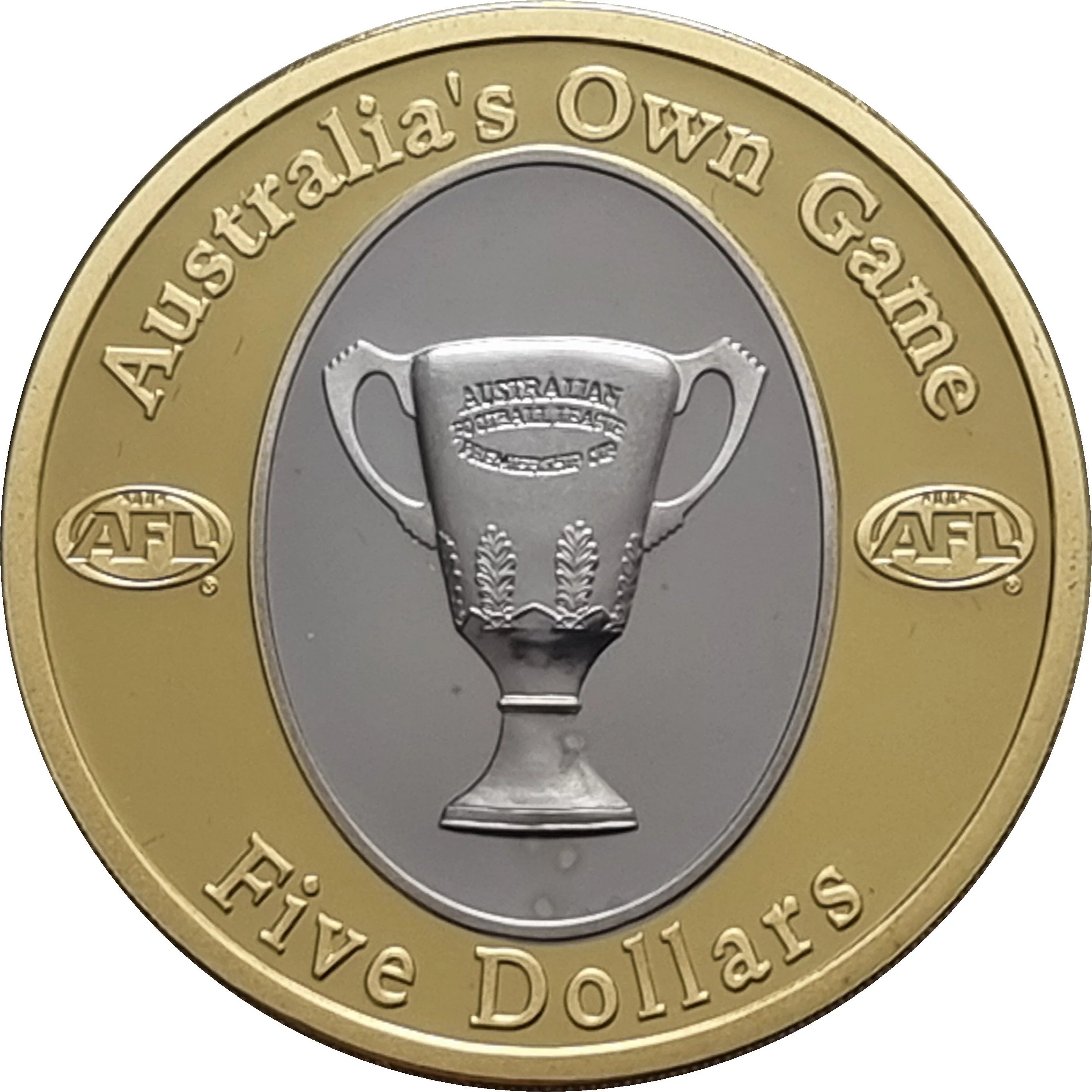 The Premiership Cup within an oval, flanked by two AFL footballs on the gold-plated sections.