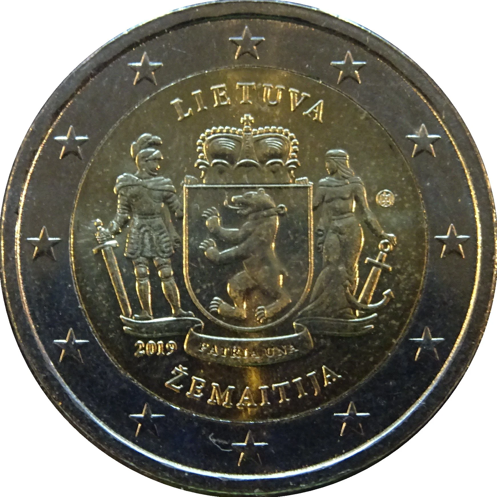 The coin's center depicts Samogitia's historic bear within a crowned shield, held by a soldier (symbolizing courage) and a goddess with an anchor (symbolizing hope). Below is the Latin inscription PATRIA UNA. Surrounding are the inscriptions LIETUVA, ŽEMAITIJA, the year 2019, and the mintmark. The outer ring features the 12 stars of the EU flag.