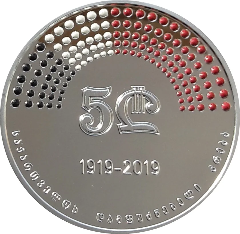 Description: Central value, 130 small circles above in 5 rows, colored white, black, and red (colors of Georgia's first flag). Commemorative date below value, Georgian lettering at bottom.