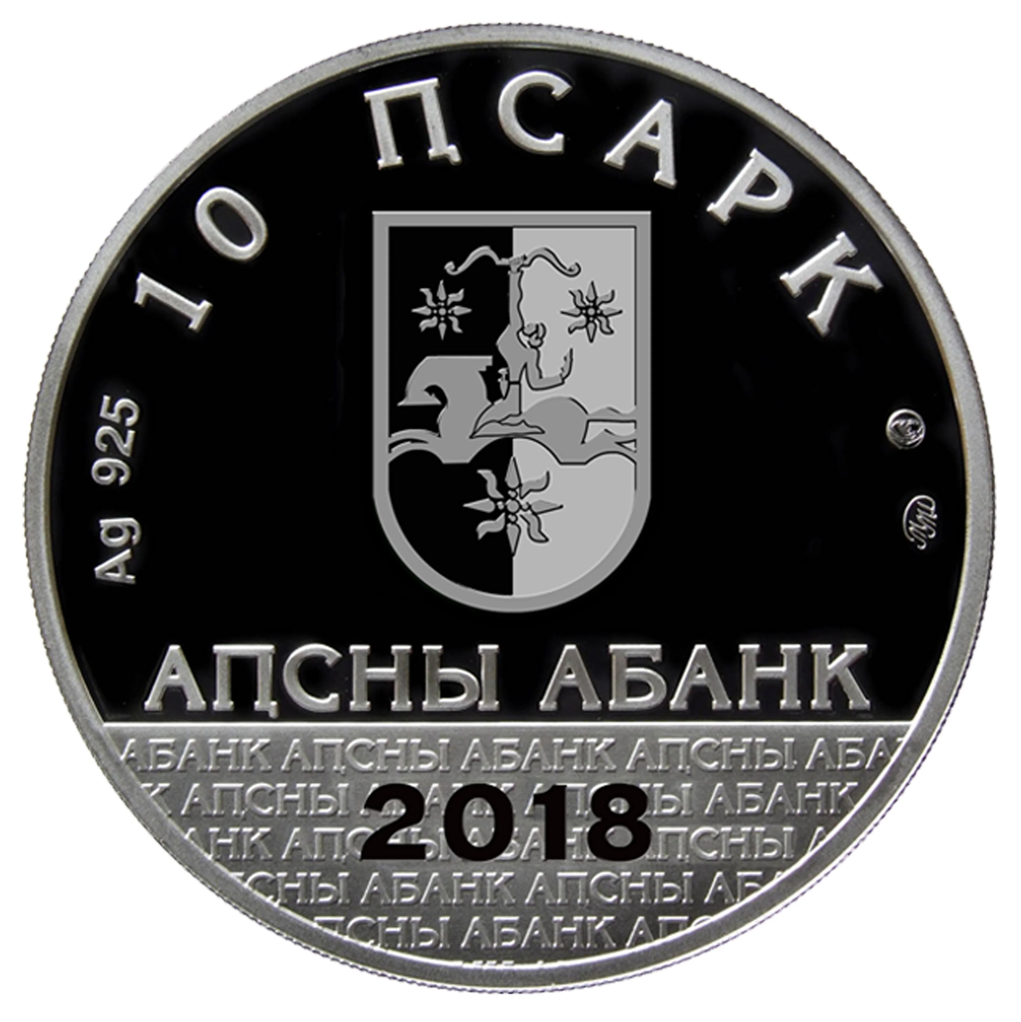 The national emblem of Abkhazia is centered above the Abkhaz inscription "Apsny Abank," with the denomination "10 apsars" above it. The mint year "2018" is at the bottom.