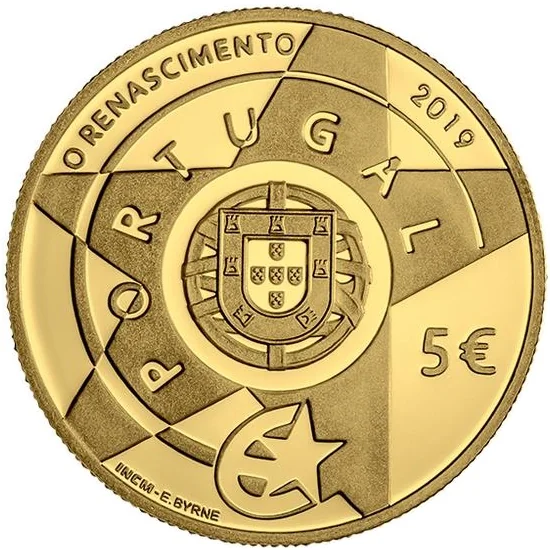 Against a starry background, Portugal's coat of arms is centered, encircled by "Portugal" and "O renascimiento." It includes the €5 value, Euro logo, 2019, and the Mint and engraver names.