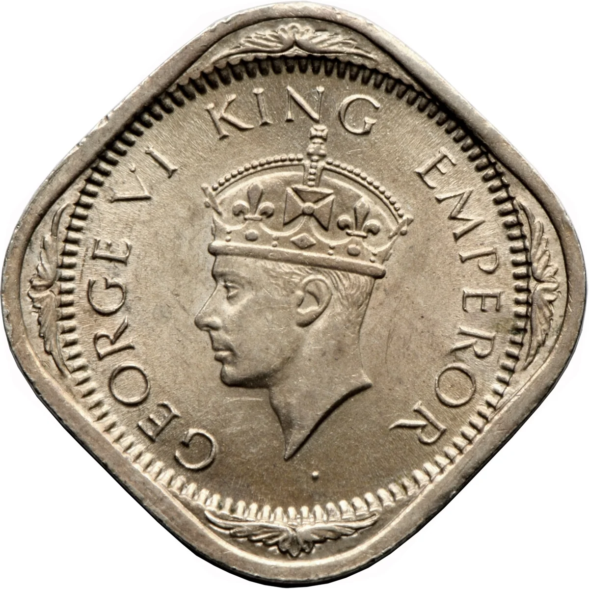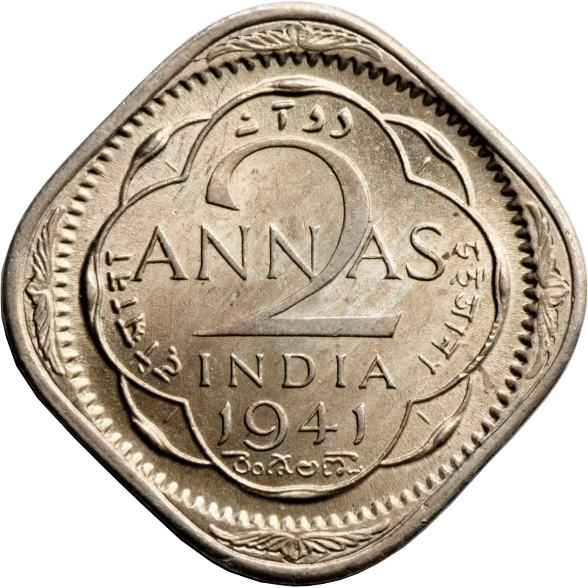 Floral design with denomination, date, and "two annas" in Urdu, Bengali, Nagari, and Telugu.