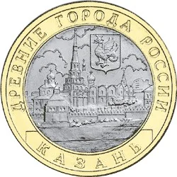 A riverside panorama of Kazan under the city's coat of arms. The rim is inscribed "ДРЕВНИЕ ГОРОДА РОССИИ" (ANCIENT RUSSIAN TOWNS) above and "КАЗАНЬ" (KAZAN) below.
