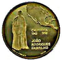 João Rodrigues Cabrilho, first European to explore California's coast, stands beside a map and legend.