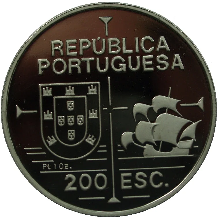 Portuguese shield with a 16th-century sailing ship before the Cross of Christ. Denomination below.