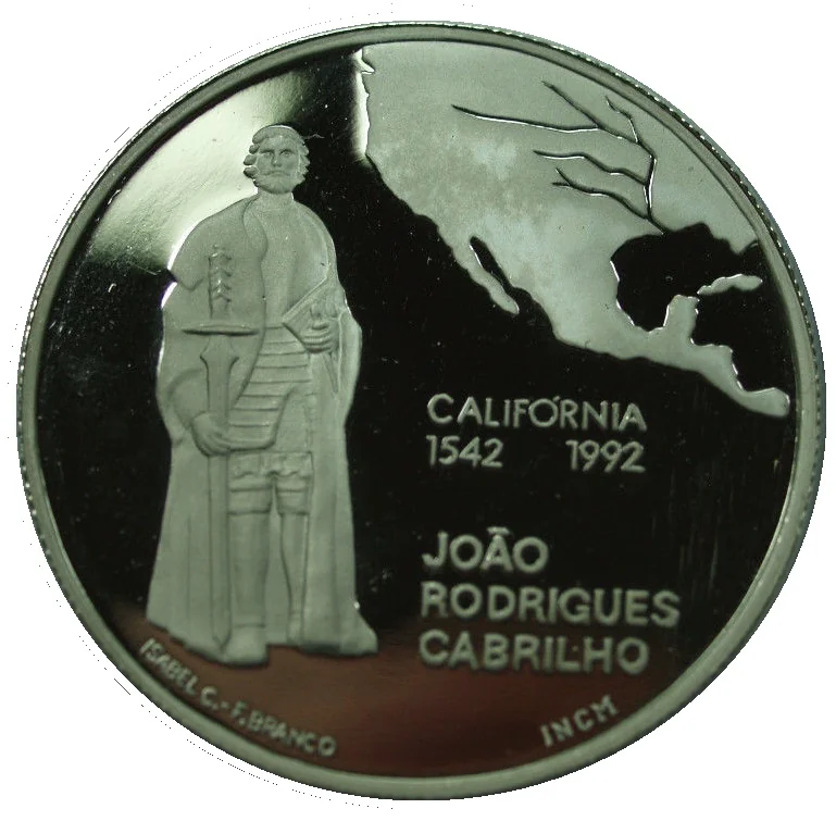 João Rodrigues Cabrilho, first European to explore California's coast, stands beside a map and legend.