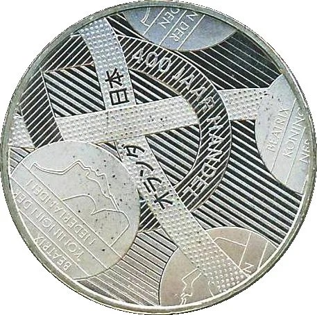 Ribbons with "NEDERLAND JAPAN" in Japanese and Dutch, surrounded by stylized coins. One shows "5 EURO," another "2009."