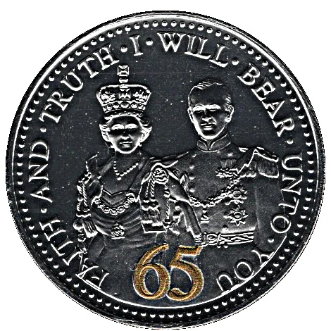 Queen Elizabeth II and Prince Philip, gold "65" below.