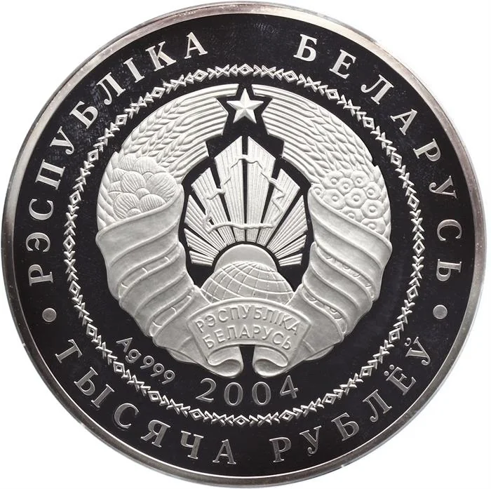 The circular ornament features the relief of the Belarusian State Coat of Arms. Below are the year and silver standard. The rim is inscribed "РЭСПУБЛІКА БЕЛАРУСЬ" above and "ТЫСЯЧА РУБЛЁЎ" below.