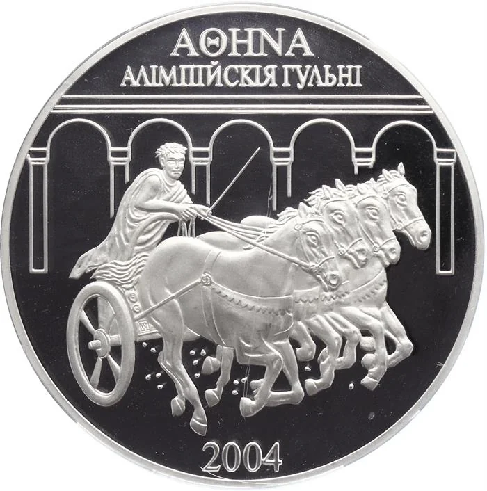 Against a colonnade, a Hellene drives a four-horse chariot. Above: "АΘHNA" and "АЛIМПIЙСКIЯ ГУЛЬНI". Below: "2004".