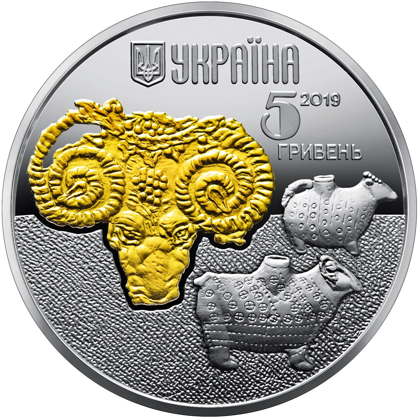 The coin features Ukraine's small coat of arms, "УКРАЇНА," "5 ГРИВЕНЬ," and "2019." Its central golden relief depicts a ram's head (Black Sea north coast), with Sarmatian ceramic ram vessels from a Neizats, Crimea, tomb to the right.