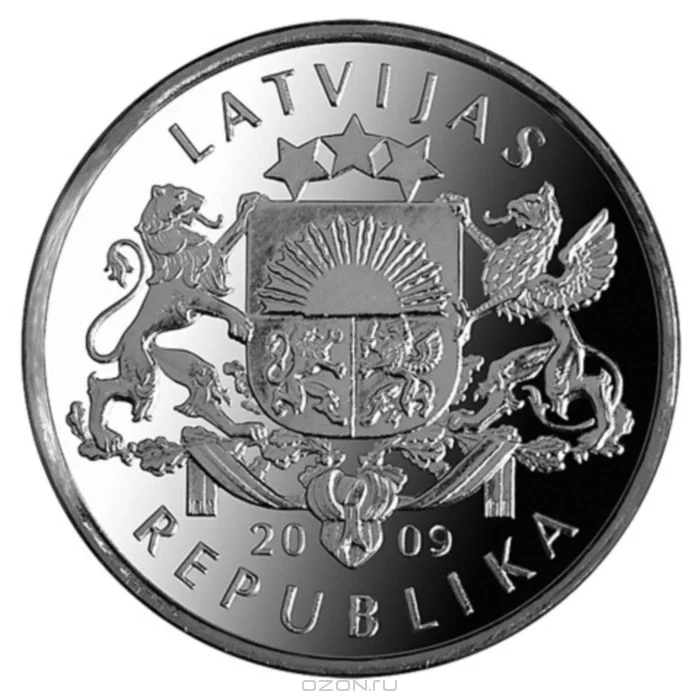 The Latvian coat of arms with the year 2009 below is centered, with "LATVIJAS" arched above and "REPUBLIKA" arched below.