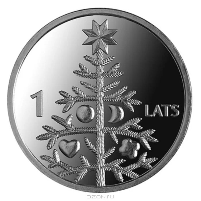 A decorated Christmas tree is centered on the coin, flanked by the numeral 1 and the word LATS.
