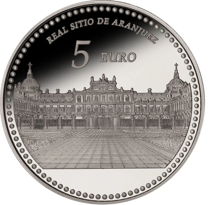 The reverse depicts the main facade of the Royal Palace of Aranjuez in Madrid.
