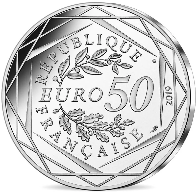 The obverse features the face value with oak and laurel branches, suggesting the Euro sign. The reverse motifs are framed by lines forming France's hexagon.