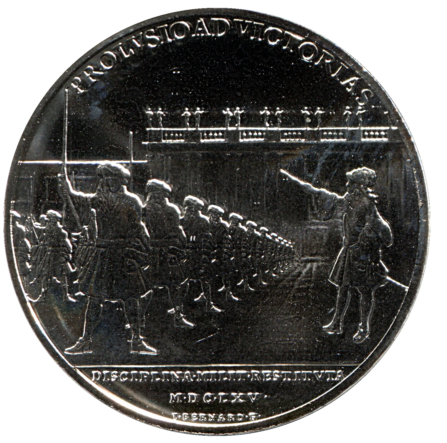 The reverse mirrors the 1665 medal of Louis XIV commanding his Musketeers.