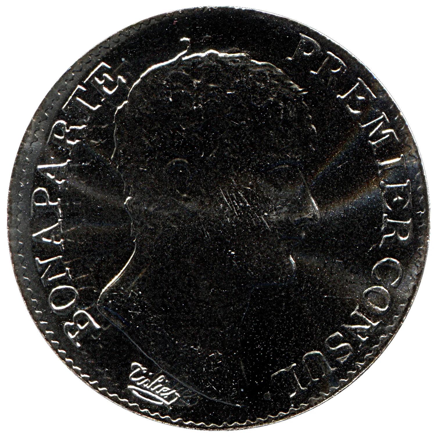 The reverse features the Germinal Franc, established by law on March 27, 1803, under First Consul Napoleon Bonaparte. The coin contains 4.5 grams of pure silver.