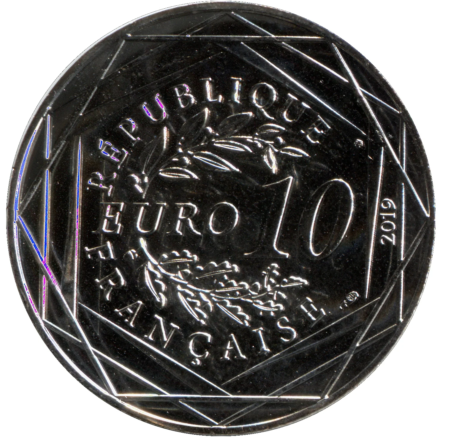 The obverse features the face value with oak and laurel branches, suggesting the Euro sign. The reverse motifs are framed by lines forming France's hexagon.
