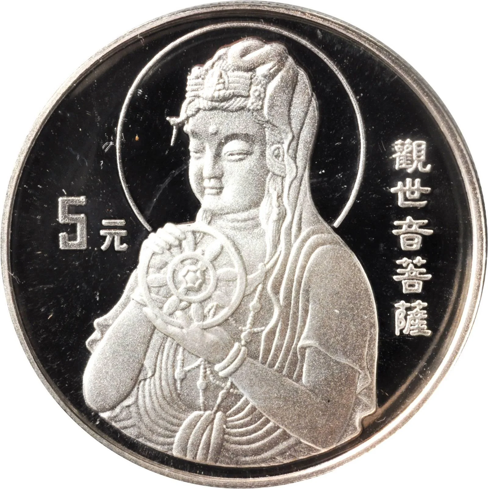 Guan Yin with golden wheel, left-facing three-quarter view, denomination at right.