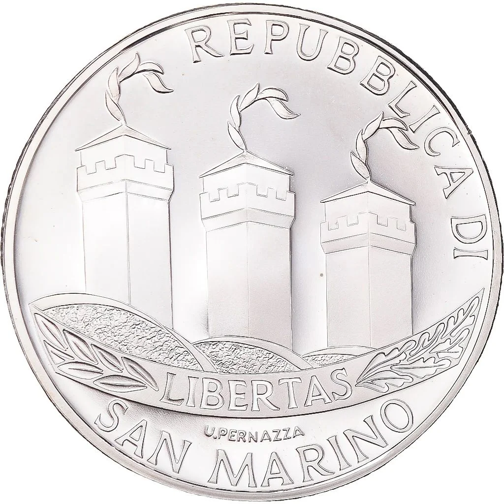 San Marino's three towers above a feather, with "Libertas" encircled by oak and laurel.