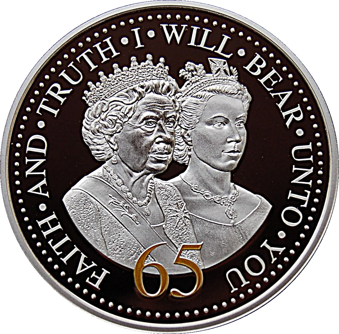 A dual portrait of Queen Elizabeth II, now and at her accession, with words from her coronation oath and a large gold "65."
