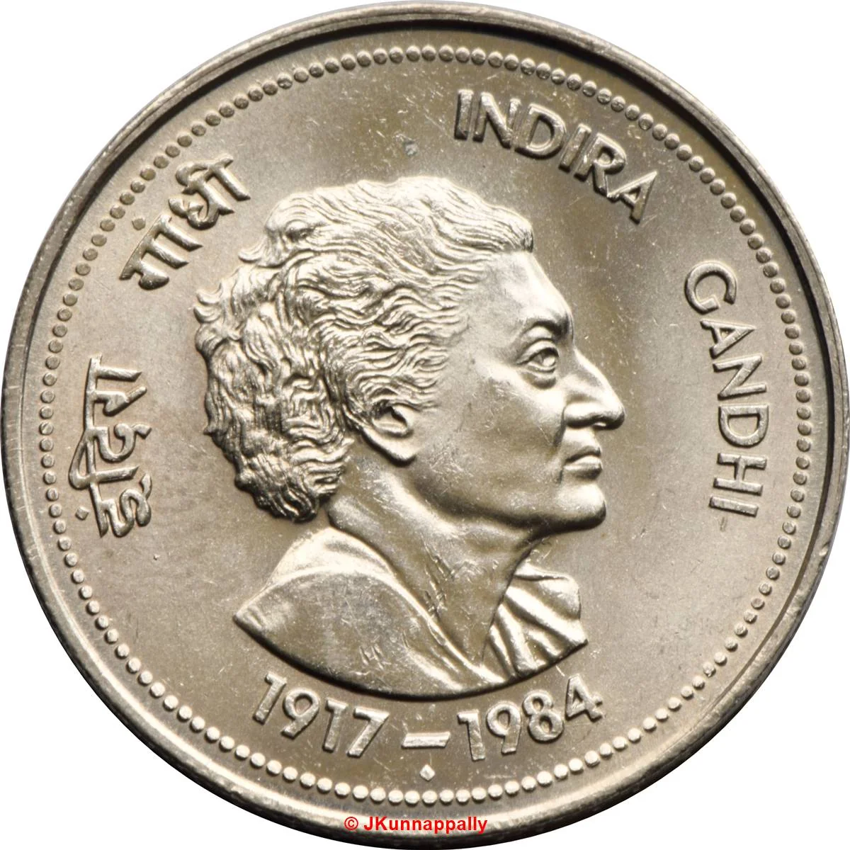 Indira Gandhi bust facing right. Mintmarks: ♦ or B = Mumbai; * = Hyderabad.